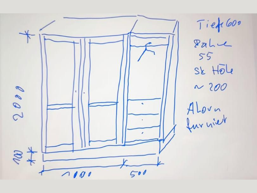 Damit ich weiß, was du von mir brauchst, sendest du mir am besten eine Skizze (gerne eine einfache, grob bemaßte Ideenskizze), Material- und Farbwünsche, Art des zu erstellenden Möbels und so weiter.